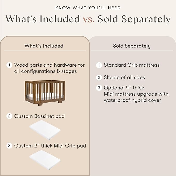 - WHAT'S INCLUDED: Everything but the full-size mattress! Purchase includes all hardware and parts needed to convert to any and all stages, plus a 1” bassinet pad & custom 2” midi pad (note: not standard mini crib size)