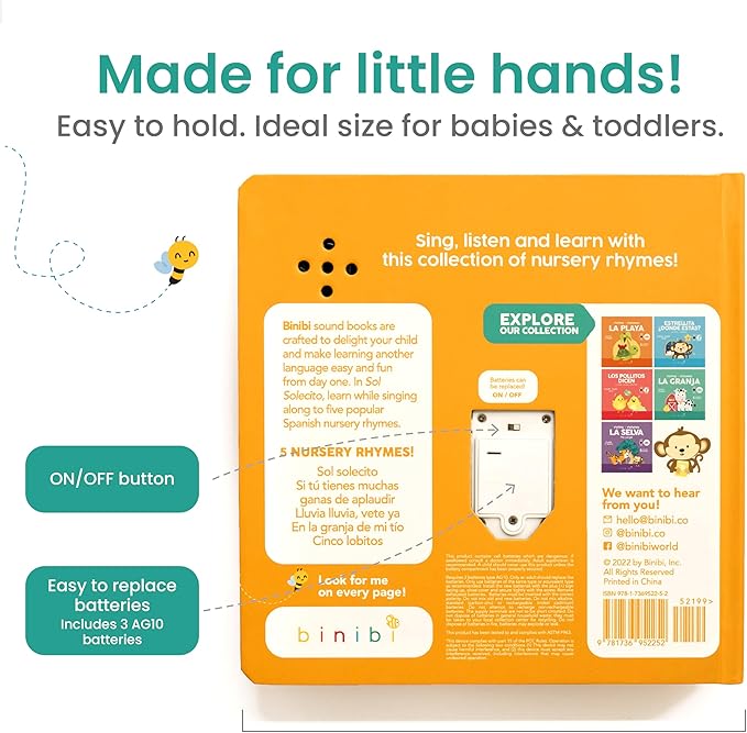 - ๐๐๐ฟ๐ฎ๐ฏ๐น๐ฒ & ๐ ๐ฎ๐ฑ๐ฒ ๐๐ผ๐ฟ ๐๐ถ๐๐๐น๐ฒ ๐๐ฎ๐ป๐ฑ๐. Binibi bilingual English-Spanish books for babies & toddlers 1-3 are durable and feature hard covers, thick pages and rounded corners - they are made for little hands and are easy to clean! All musical Spanish nursery rhyme books feature an on/off button for extended battery life, and easily replaceable batteries. 3 AG10 batteries in every book.