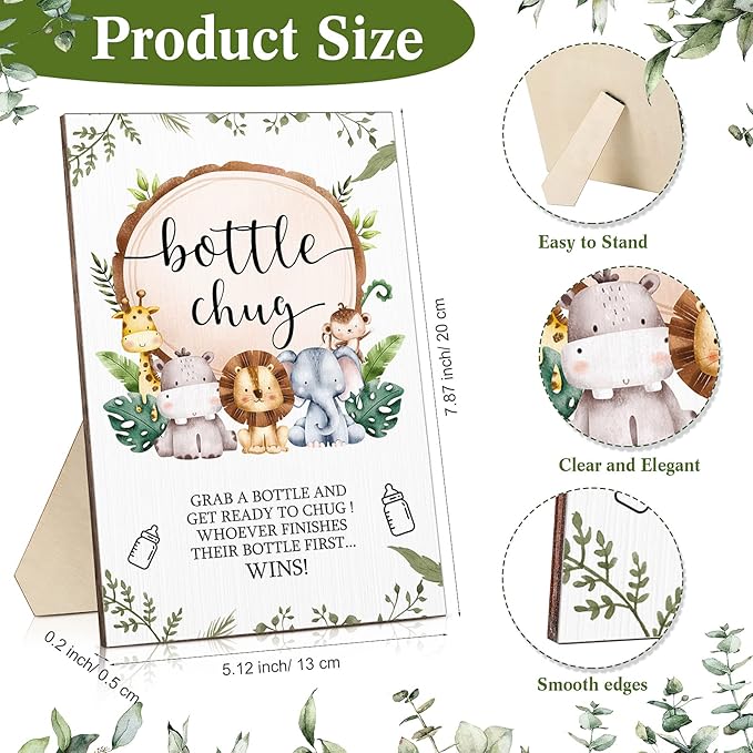 - Functional and Beautiful Design: the baby shower game sign is decorated with cute animals, elegant and attractive, and can bring more color to your party; Besides, its surface is printed with explainable words, which allow you to understand how to play this bottle chug game at once