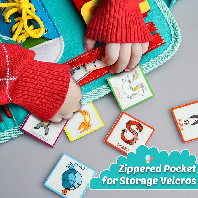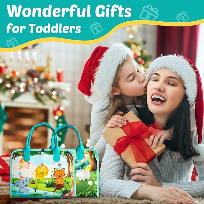 - PORTABLE TRAVEL TOY: Thanks to the lightweight felt material and handbag design, kids can take it anywhere they want to go, this Montessori Busy Board is also very easy to carry in the car or airplane, this toddler toy will capture your child's attention and keep them occupied and quiet on long journeys.