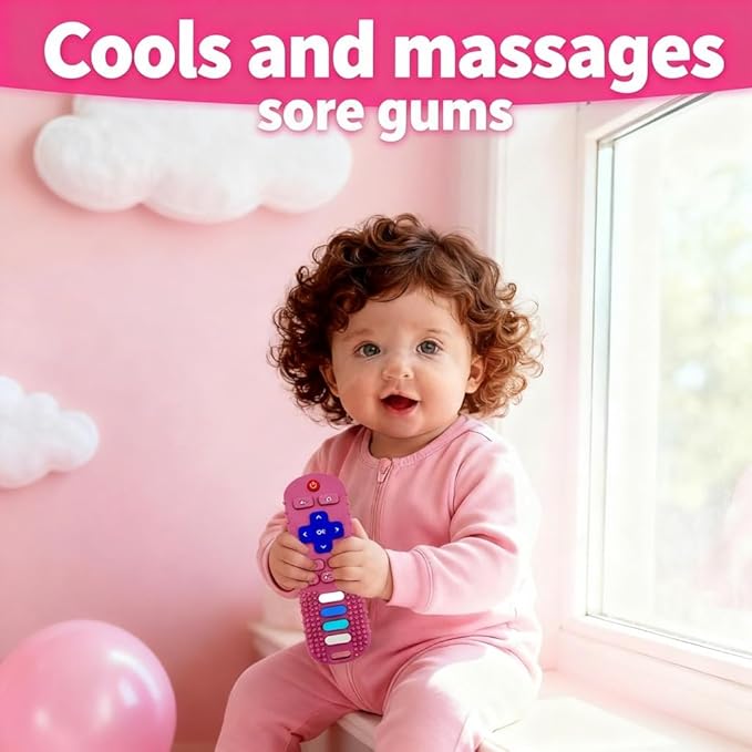 Baby Teether Toy,TV Remote Control Shape Teething Relief Chew Toy for Infants 3-24 Months, BPA Free, Pink
