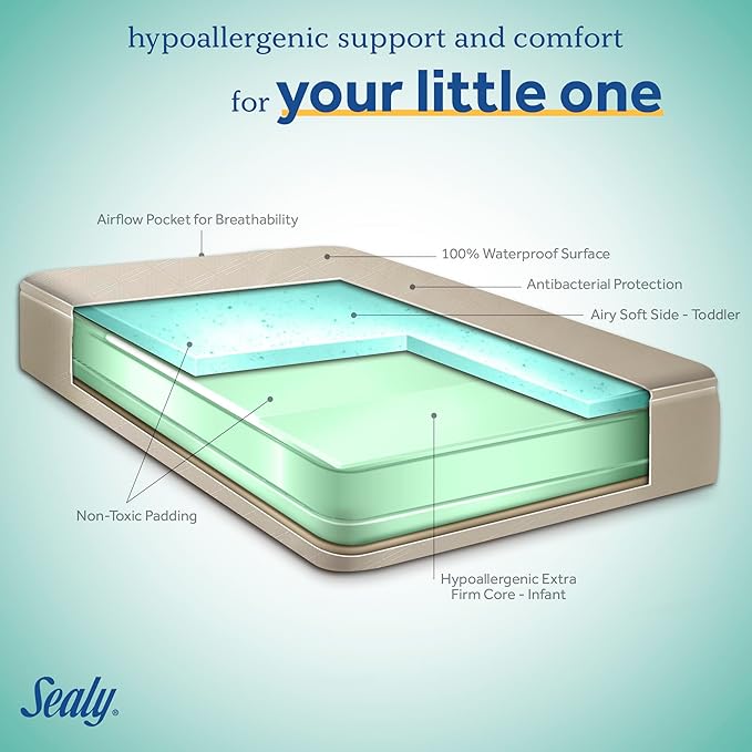 Sealy Baby Orion Antibacterial 2-Stage Breathable Crib Mattress, Toddler Bed Fit, Lightweight, Waterproof, Non-Toxic, GREENGUARD Gold Certified, USA Made, Safety & Quality Tested, 52x28