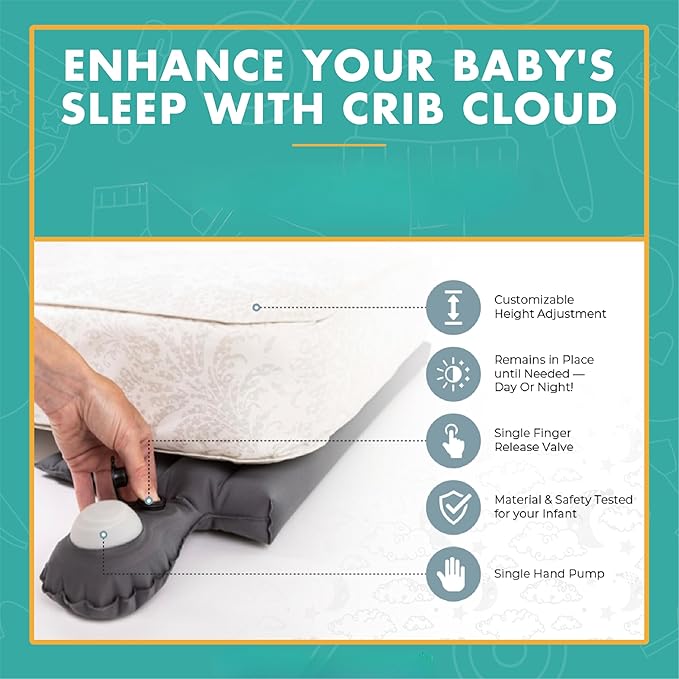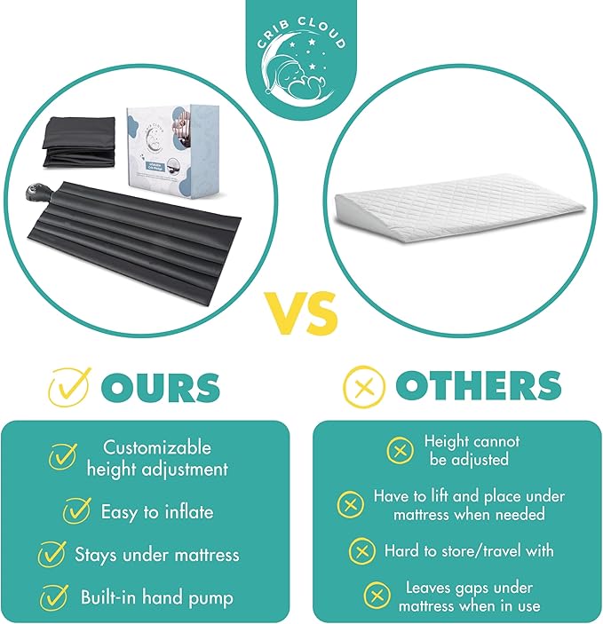 - Easy to use: Crib-Clouds anti-reflux newborn pillow is incredibly easy to use. Simply place it under your infant’s mattress and inflate it to the desired height for optimal comfort. Adjust the air as needed to find the perfect incline for your baby. When not in use, the wedge easily deflates for storage. You can keep it under the mattress, ready to provide comfort and support whenever you need it again.