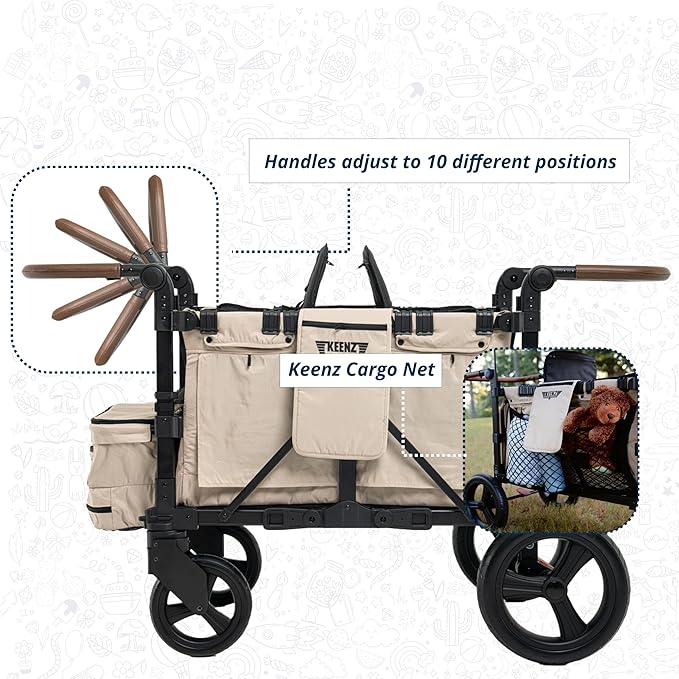- Spacious Storage & Family-Friendly Features- Includes a cargo net, built-in snack tray with cup holders, and dual leather handlebars for push or pull flexibility—perfect for keeping gear and snacks within easy reach.