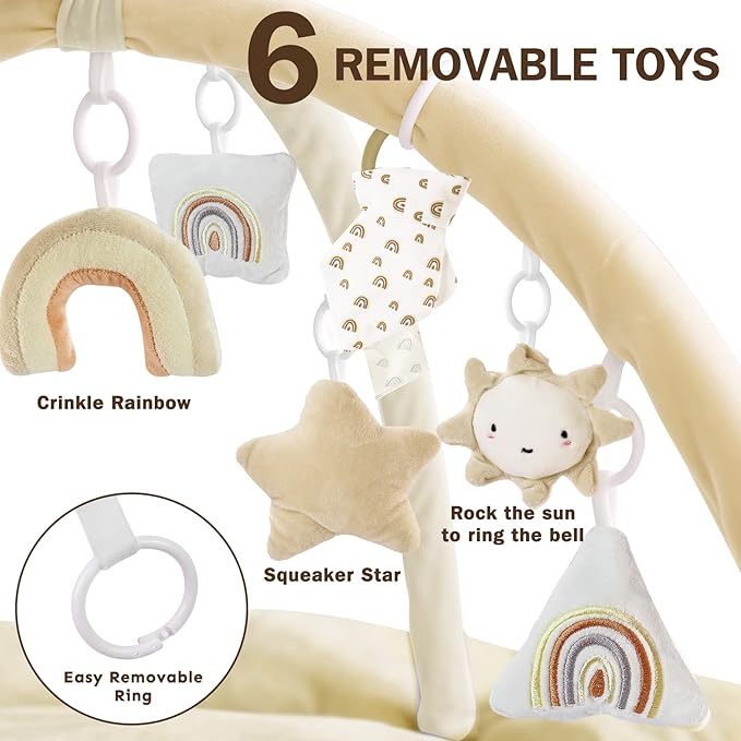 - 6 DETACHABLE SENSORY TOYS: The baby play mats for floor feature 6 detachable toys (a star, sun, rainbow, etc) that encourage your babyโs cognitive and motor skills. The toys are designed to stimulate your baby's sight, hearing, and touch with different textures, colors, and sounds.