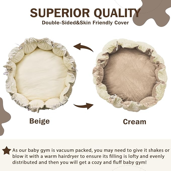 - NOTE: To maintain the pristine condition, our play gym is carefully vacuum packed. After receiving the package, shake it or use a blow dryer to restore its shape and volume. Plus, do not leave your baby alone on the mat; use it under adult supervision for optimal safety.