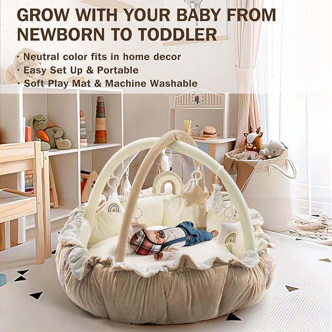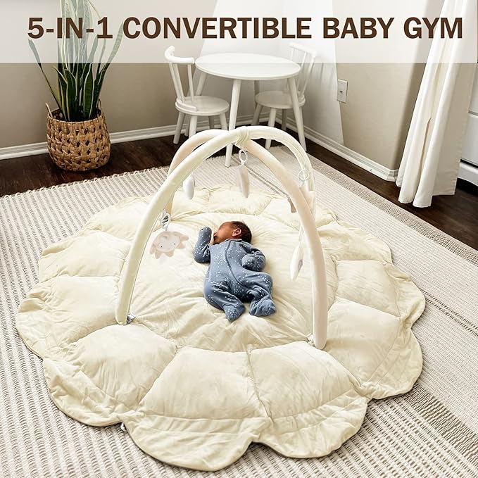 - 5-IN-1 CONVERTIBLE BABY GYM: Our tummy time mat is a perfect combination of baby gym, baby nest, play mat, ball pit and fence, creating a safe and enclosed play area. The versatile design offers various entertainment for kids, making tummy time more enjoyable.