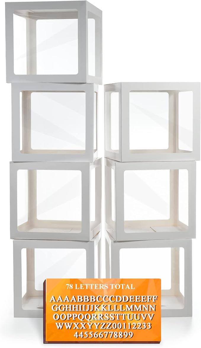- Specification of Balloon Boxes: Party letter boxes set come with 7 PCS 11.8"(L)x11.8"(W)x11.8"(H) White Transparent Balloon Boxes, 78 PCS 5.5" Height white Letters & Numbers, which can be suitable for most party, festival, anniversary, holiday decorations