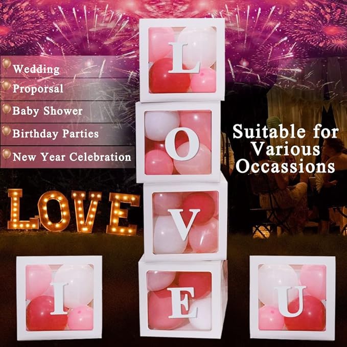 White Transparent Balloon Boxes With 78 Letters, Name Boxes for Baby Shower, Clear Baby Box Blocks Backdrop for 1st Birthday, Bridal Shower, Graduation Prom Party, Gender Reveal Decoration, 6 PCS