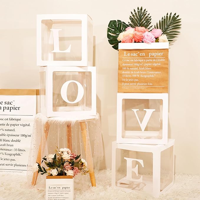 - Durable White Transparent Balloon Boxes: Set of 4 party boxes made of durable paper and clear plastic with 78 letters and numbers for decorating parties and holidays.
