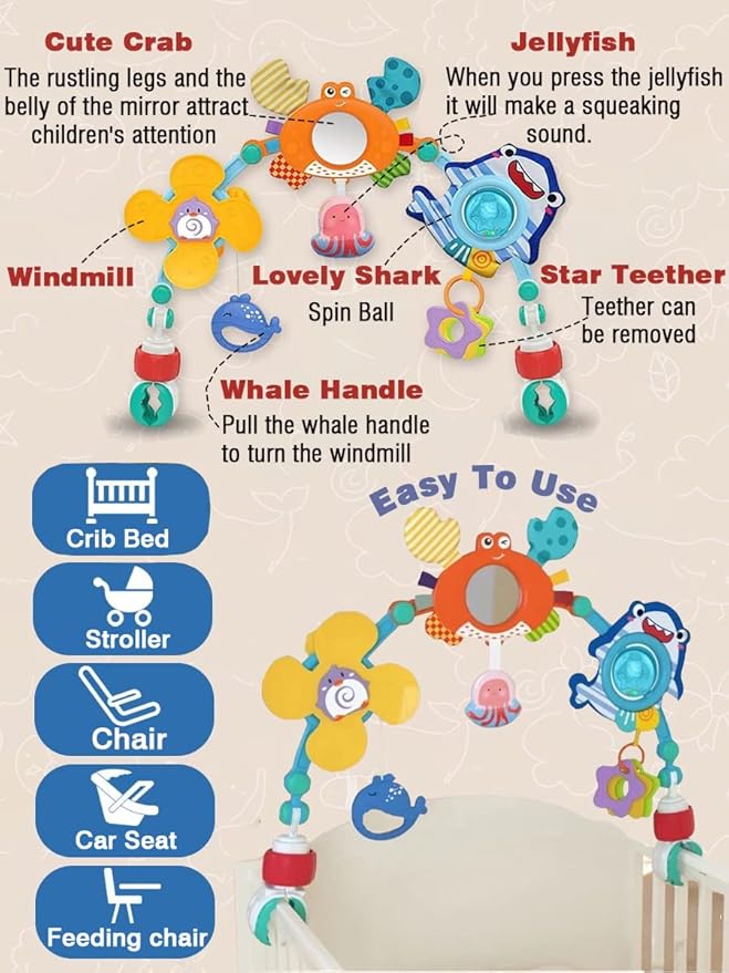 - Carseat toys for infants 0-6 months,Stroller toys have variety of graphics,Penguin Windmill.Whale Handle.Star teether.Cute crab have rustling legs and the belly of the mirror attract children's attention.Bullt-in BB squeaker in the Jellyfish press to make a Bi~ Bi~ sound.Lovely Shark colorful rotating ball rattle.
