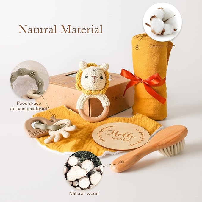 - SAFETY FIRST: Our Baby Shower Basket aims to bring comfort, happiness, safety, and security to babies.Newborn blanket, Drool Towel material is made of 100% soft cotton to take care of baby's safety, the baby teether is BPA-free, safe for your baby to chew.Record the milestones of your child's appearance in the world, natural goat hair soft brush, handmade wooden rattle, the raw materials of the wooden part are all natural wood!