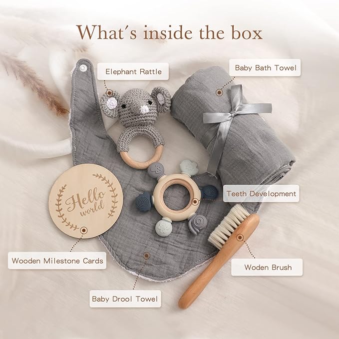 - NEWBORN BABY GIFT BASKET: This is our most thoughtful baby shower gift idea for new parents! Newborn gift set includes: 1 * Blanket, 1 * Teether, 1 * Hair Brush, 1 * Rattle, 1 * Baby Milestone, 1 * Drool Towel & Gift Box. We make sure you won't be disappointed with our beautifully designed newborn gift sets!