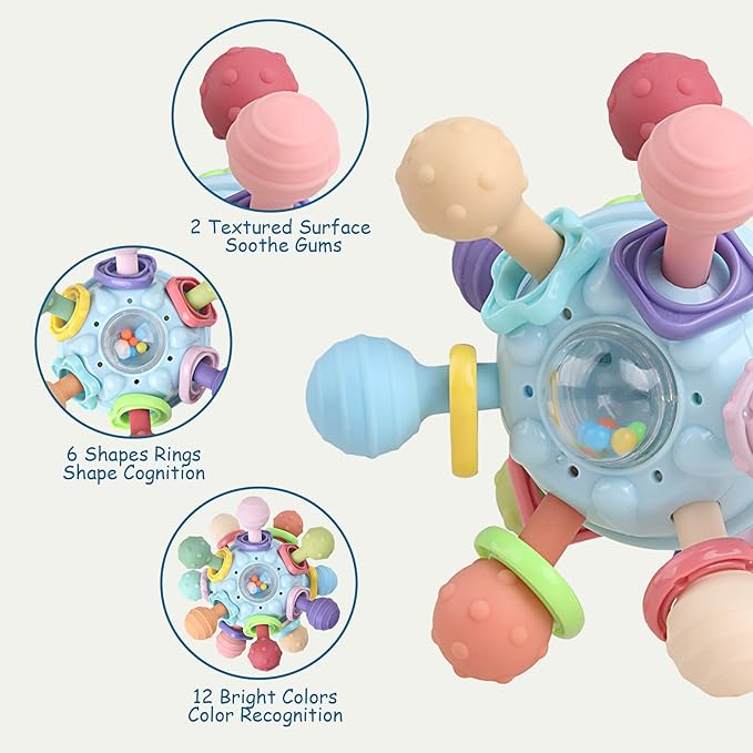 - Soft Rattling Sound : This toy features 12 gnawing points with rattle rings that slide back and forth, producing gentle rattling sounds that engage and stimulate your baby's senses. It can twist 180Β° and make a satisfying clicking sound. Additionally, two 360Β° transparent balls produce a soft rattle sound while shaking that will attract your baby's attention.