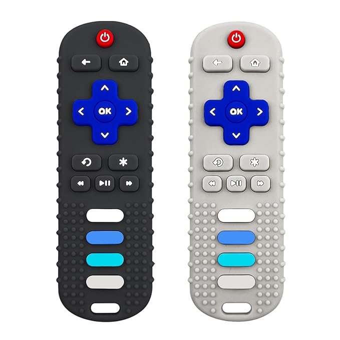 - [Must Have for Baby Teething]: The silicone TV remote teether toys are specially designed with small size(1.7"Γ5.5"), is perfect for baby to hold and grip.The graphics on the back can help your baby learn shapes, and it can also be used as Ice Cube mold. The various textures of bumps can better relieve the discomfort of the baby's teething gums, and at the same time increase fun and enhance the baby's sensory ability.