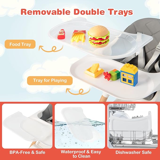 - 【Removable Double Trays】This convertible baby high chair comes with an upper food tray and a lower tray for playing. The trays are made of BPA-free & safe PP material. In addition, they are removable, dishwasher safe, waterproof and easy to clean.