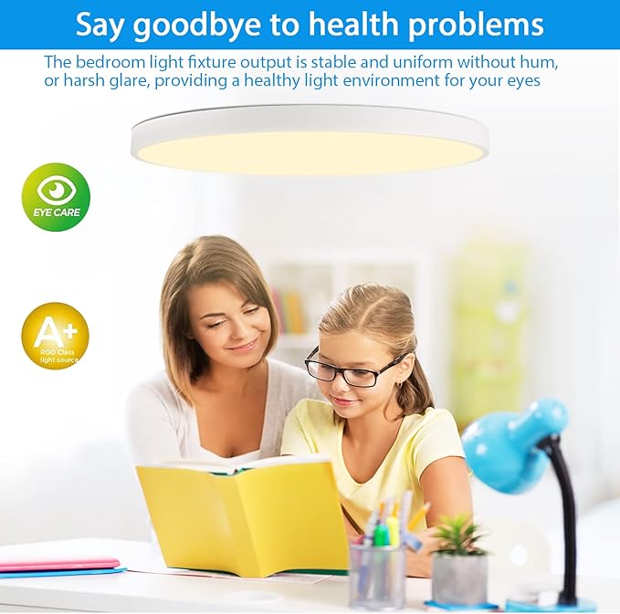 - Original Color & No Flicker: Round ceiling light CRI index up to 90, which simulates natural light to the greatest extent, making the light fixture ceiling mount closer to the realistic and original color of the object. The specially treated acrylic lampshade can soften the brightness to a greater degree. This protects you and your child's eyes from harsh light