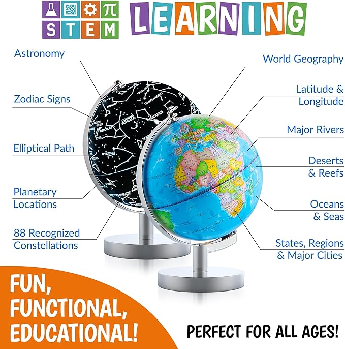 - DAY AND NIGHT FUNCTIONALITY: This illuminated world globe for kids features detailed, easy-to-read Earth geography including, continents, countries, capitals, deserts, reefs, major rivers, oceans, seas, and Earth’s natural wonders; Witness the amazing representation of 88 constellations that grace our night sky by switching on the soft LED light on this educational kids globe