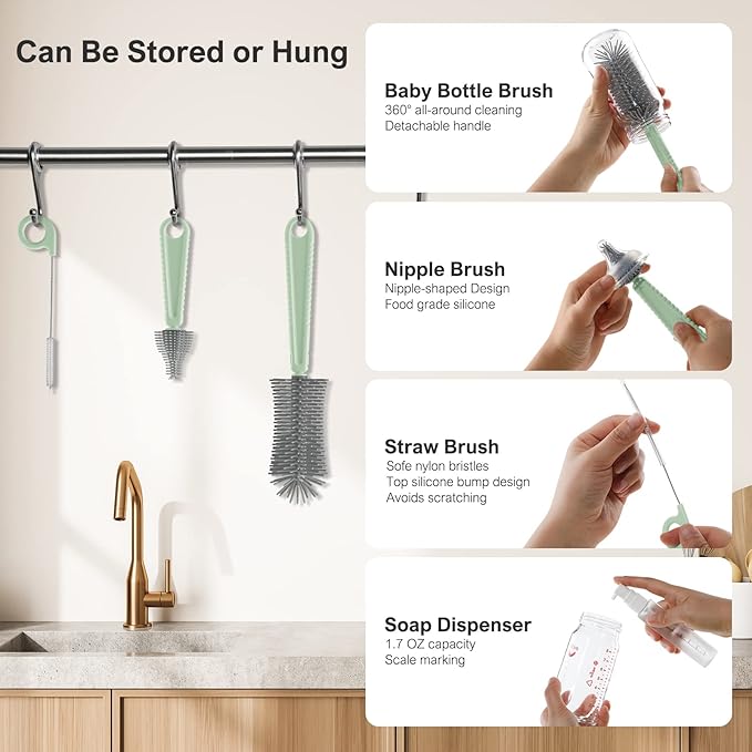 - 【Safe&Durable Material】Made of food grade ABS and liquid silicone that won't scratch bottles, safe and BPA free.The bristles are less sticky and do not collect dirt like spongs and nylon brushes,allowing mom to use more peace of mind.Except for the soap dispenser, the entire set is dishwasher safe.The silicone brush head is detachable and can be boiled, but the handle cannot be boiled
