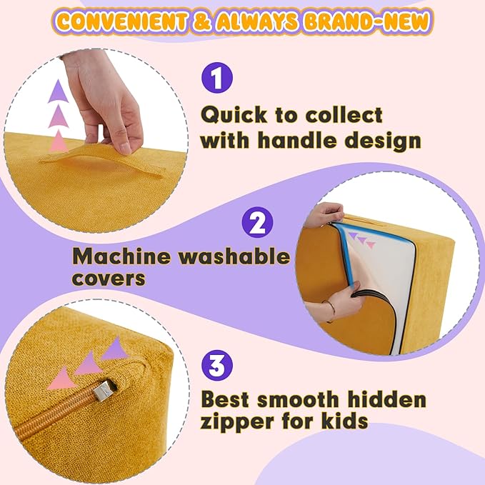 - 【EASY TO SETUP&COLLECT】: The foam climbing blocks set is easy to detach with smooth zippers, hidden zippers and handles to carry considerately designed for kids. machine washable covers, you can wash them anytime for brand-new look. Your babies will absolutely love this soft play equipment! Should you have any query please feel free to contact us , we will reply immediately.