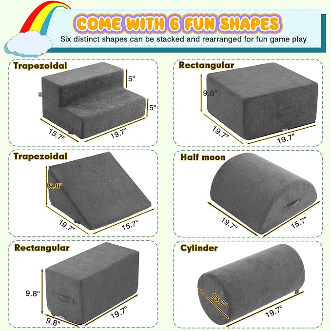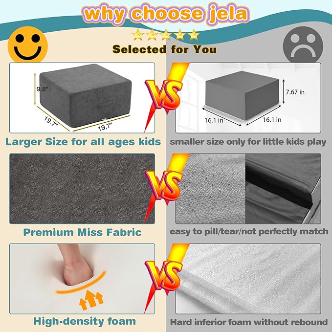 - 【SAFE AND GUARANTEED】: Jela kids foam climbing blocks set are CertiPUR-US certified, non-toxic, environmentally friendly, and odorless fabric with OKEK-TEX approved. The soft play climbing for toddlers with hidden zippers are designed to avoid scratching children's soft skin. We focus on offering kids a reassuring environment to play, the product is built without hard structure or smooth edges, to prevent kids from bumping.