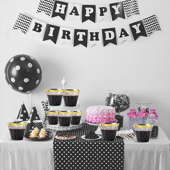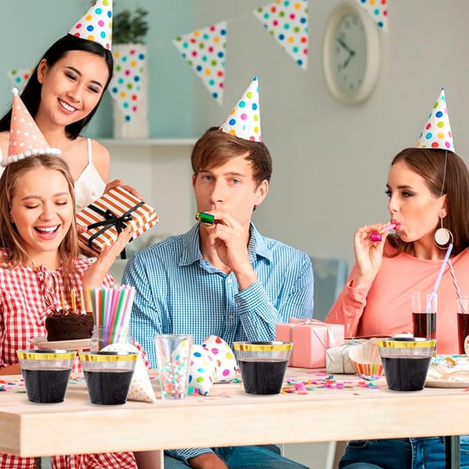 Superrnal 100pcs Gold and Black Plastic Cups 9OZ Elegant Gold Rimmed Clear Party Cups Fancy Disposable Wedding Cup Plastic Cup for Party,Gatherings, Afternoon Tea