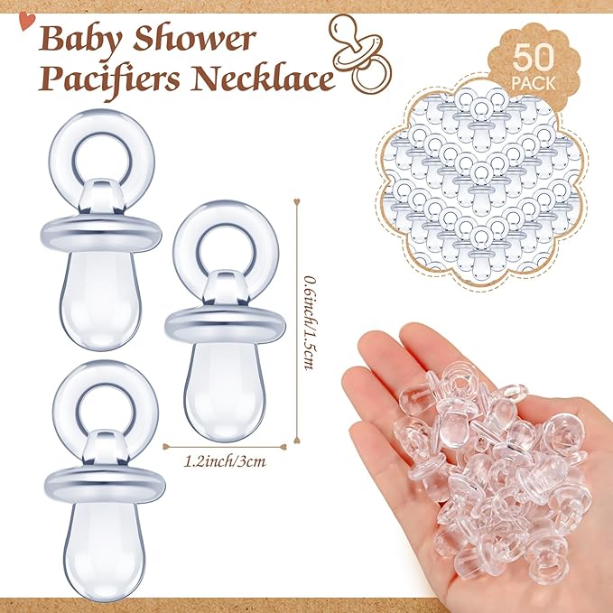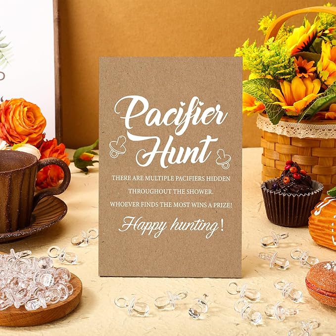Thyle 51 Pcs Pacifier Hunt Baby Shower Games Include Hunt Sign and 50 Acrylic Pacifiers for Baby Shower Game Decoration Gift Sets Gender Reveal Party Decor(Kraft)