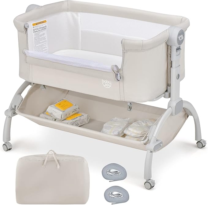 BABY JOY Baby Bassinet, 3-in-1 Rocking Bassinet w/Storage Basket, Double-Lock Design, 7 Adjustable Heights, Soft Mattress & Portable Travel Bag, Bassinet Bedside Sleeper for Newborns Infants (Beige)