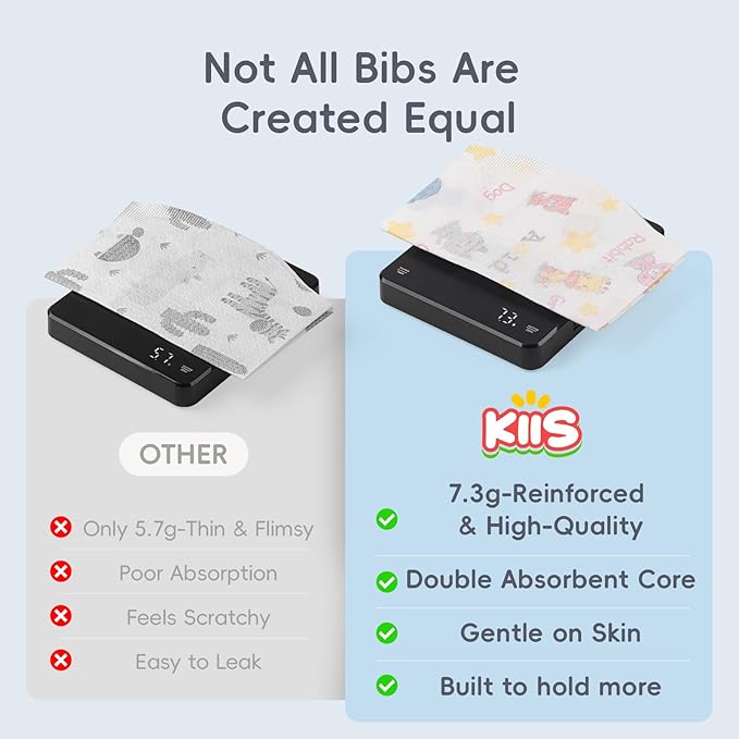 - Comfortable & Reliable: Our waterproof toddler bib is made of a four layer of fabrics, with the first layer being a non-woven fabric, skin-friendly, and comfortable to wear. KIIS Baby Disposable Bibs is also breathable and waterproof, keeping your baby's clothes clean and dry after feeding. Additionally, the fabrics contain no harmful chemicals such BPA, PVC, Phthalates, lead, or toxins making the bib super safe for babies and toddlers.