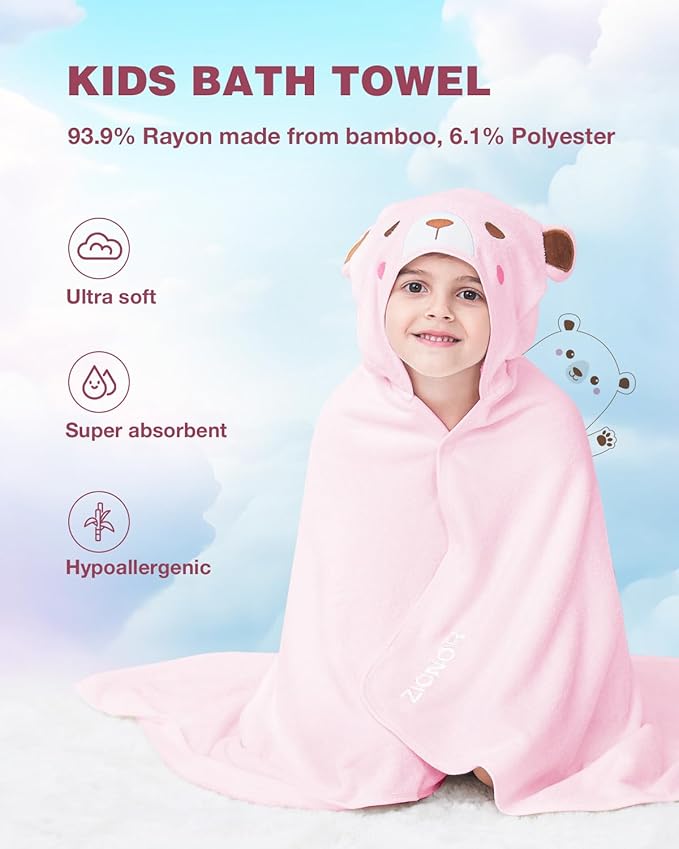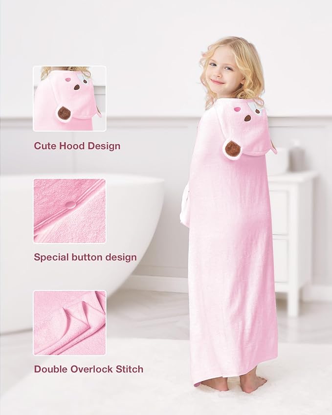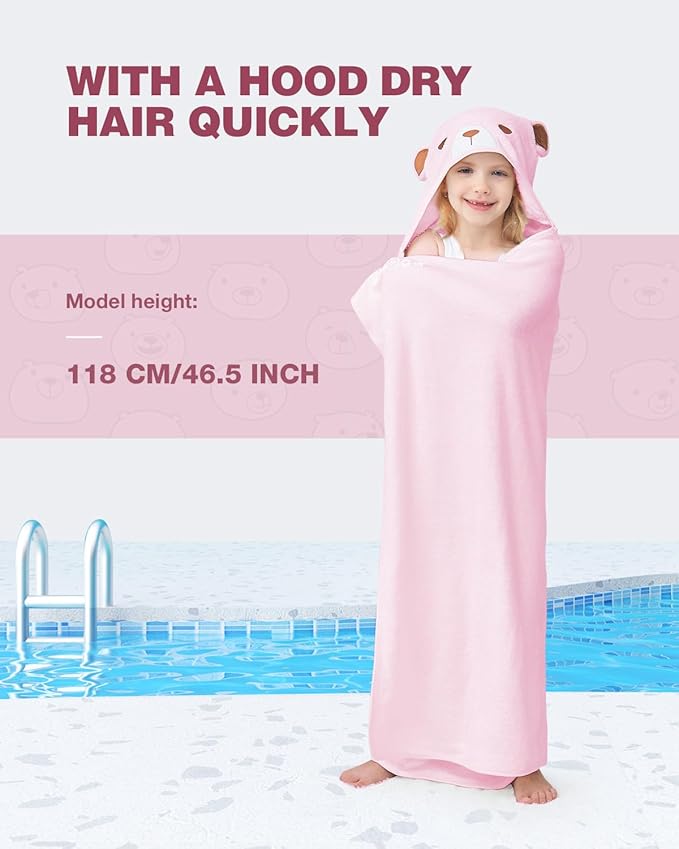 ZIONOR Hooded Bath Towel for Kids - 50''L x 35''W Extra-Large Hooded Towels for Big Kids 6-10, Kids Beach Towels Made from Bamboo Rayon, Suitable for Bath, Pool, Beach(Pink Bear)