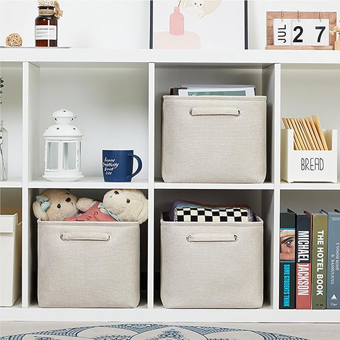 - 【3 Large Storage Bins】Cationic fabric storage baskets bin, Set of 3 Canvas storage bins for storage, 15” (L) x 11” (W) x 9.5” (H). This set of linen collapsible baskets for organizing can be used alone or with a cabinet, shelves, closet, bookcase, etc