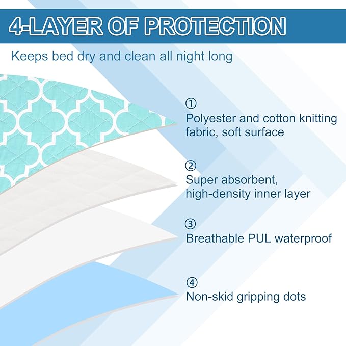 - Ultimate Waterproof & Absorbent Protection for Incontinence & Bedwetting: Experience complete peace of mind with our washable mattress protector. The advanced 4-layer design features a soft, skin-friendly surface, a super-absorbent core that locks away moisture, a breathable waterproof barrier, and a non-slip bottom. This reusable bed pad ensures your mattress stays perfectly dry against adult incontinence and potty training accidents, offering comfortable, all-night protection