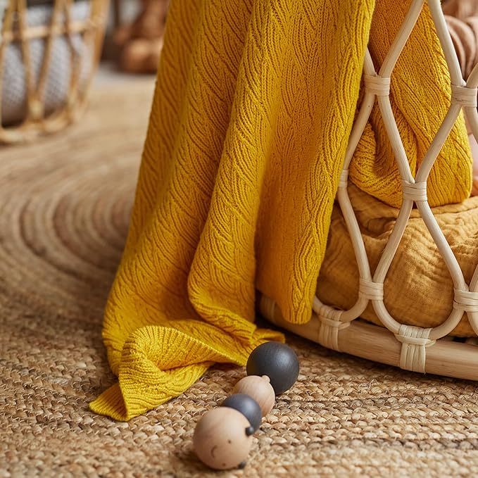 Knitted Organic Cotton Baby Blanket- Swaddle Blanket, 30" x 40" Soft Receiving Blanket for Newborn (Waves-Yellow)