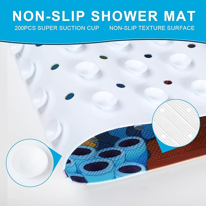 - ✅【Non-Slip & Full Protectation Kids Shower Mat】 Our toddler bath mat non-slip for tub features 200 strong suction cups for a secure hold and a textured surface without raised bubbles, offering extra grip and comfort for your child. 40x16 inches extra-long size ensures full coverage, providing complete protection for your family