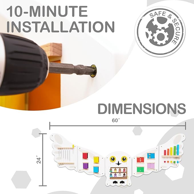 - Completely Assembled & Easy to Install: No assembly required! Pre-drilled holes and included screws make wall-mounting this wooden busy board a 10-minute task for busy parents.