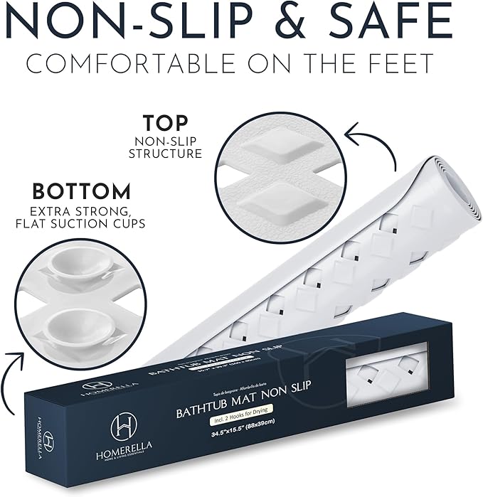 homerella® Bath Mat for Tub Non Slip Mold Resistant 35x16 - Shower Mat Non Slip Anti Mold - Bath Tub Mat Suction Cups incl. Hooks for Drying - Bathtub Mat Non Slip - ANI Slip Shower Mat Inside Tub