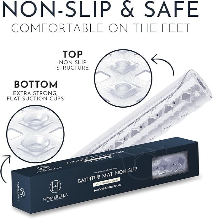 homerella® Bath Mat for Tub Non Slip Mold Resistant 35x16 - Shower Mat Non Slip Anti Mold - Bath Tub Mat Suction Cups incl. Hooks for Drying - Bathtub Mat Non Slip - ANI Slip Shower Mat Inside Tub
