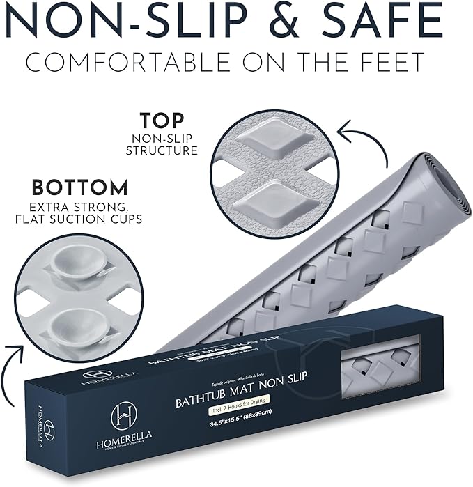 homerella® Bath Mat for Tub Non Slip Mold Resistant 35x16 - Shower Mat Non Slip Anti Mold - Bath Tub Mat Suction Cups incl. Hooks for Drying - Bathtub Mat Non Slip - ANI Slip Shower Mat Inside Tub