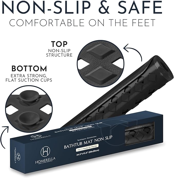 homerella® Bath Mat for Tub Non Slip Mold Resistant 35x16 - Shower Mat Non Slip Anti Mold - Bath Tub Mat Suction Cups incl. Hooks for Drying - Bathtub Mat Non Slip - ANI Slip Shower Mat Inside Tub