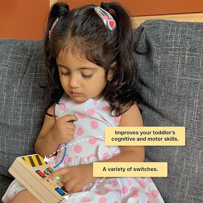 - 6 LED + 6 Buttons Light Up Busy Board Light switchboard includes different colored lights and buttons that can improve kids' sustained concentration and perception of cause and effect.