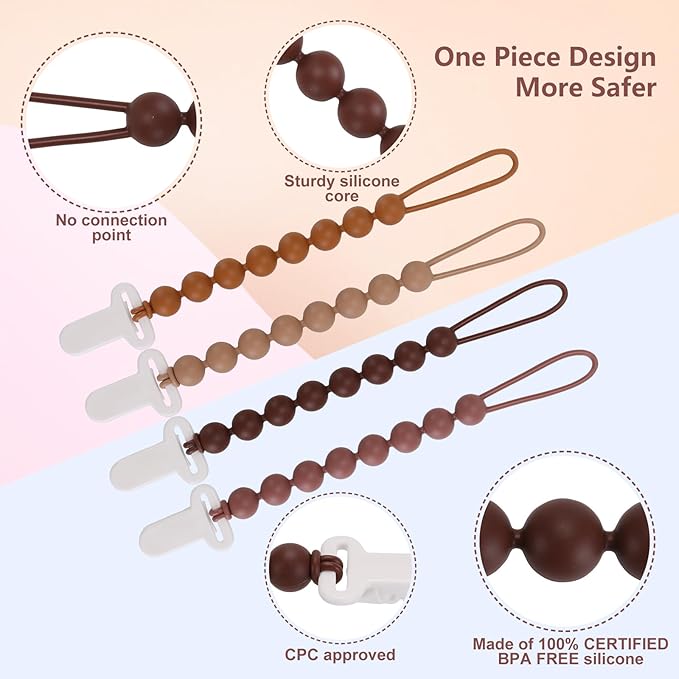 4-Pack Silicone Pacifier Clips with One-Piece Beads for Baby Boys and Girls - Flexible and Rust-Free Holders for Teething Relief and Baby Essentials, Safe for Newborns (Brown)