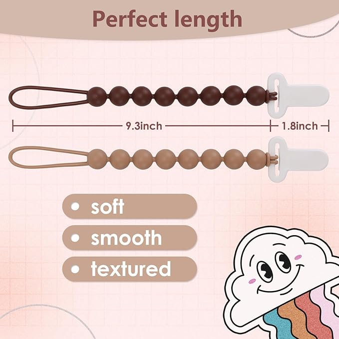 - Perfect on-the-go: Our silicone pacifier clip is perfect for busy parents on the go. Its compact size and lightweight design make it easy to attach to your baby's clothing and take with you wherever you go. Whether you're running errands, traveling, or just out for a walk, you can have peace of mind knowing that your baby's pacifier is always close by and within reach.