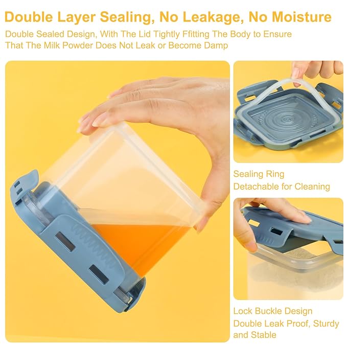 - Clever Design:Scoop Leveller Design - Help you scoop each spoon of milk powder accurately and easily. Ensure the quantity of milk powder, refusing waste; Carefully Designed Spoon Placement-For easy isolation from the milk powder; The top of the cover has a Snap Groove Design that allows for stacking of each milk powder container, saving space.