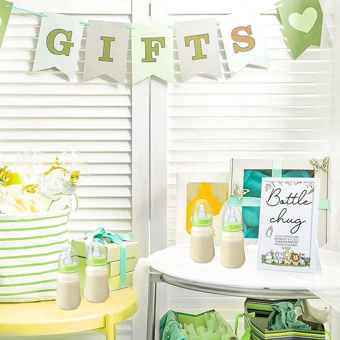 - Nice Baby Shower Games Sets: you will receive 1 piece of wooden green woodland theme bottle chug game wooden sign and 18 pieces of green baby bottle for baby shower games, 19 pieces in total, which are suitable for your baby shower parties and enough for you to share with others