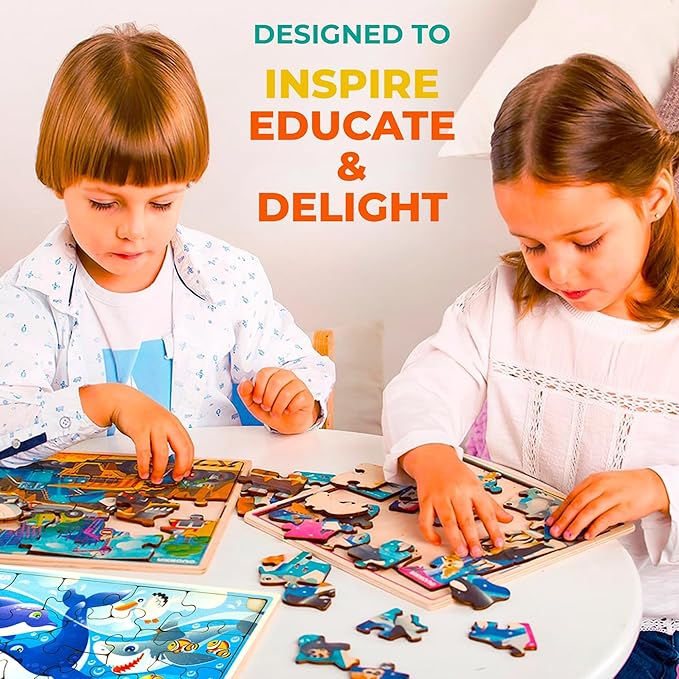 - UNIQUE WOODEN PUZZLE SHAPES: every jigsaw puzzle has 28 pieces puzzle shapes for kids to play with; We assemble them manually; Create fun learning games with Ocean; Great puzzles for kids ages 3-5 and up