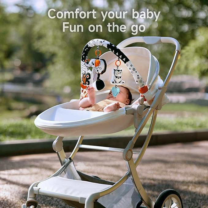 - 【Best Early Development Toy】 This stroller toys for babies 0-6 months will provide plenty of activity for your baby to watch, feel and grab. A fun squeaking sounds for your baby to explore and discover. Black and white baby stroller activity toy can not only attract the baby's attention, but also exercise the baby's color and animal cognition, hand eye co-ordination, grasping ability and sensory cognition ability.