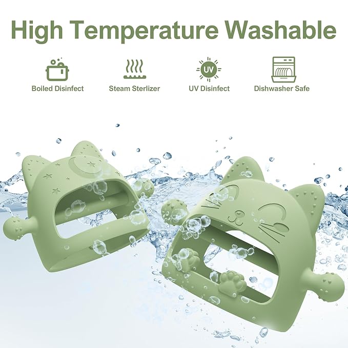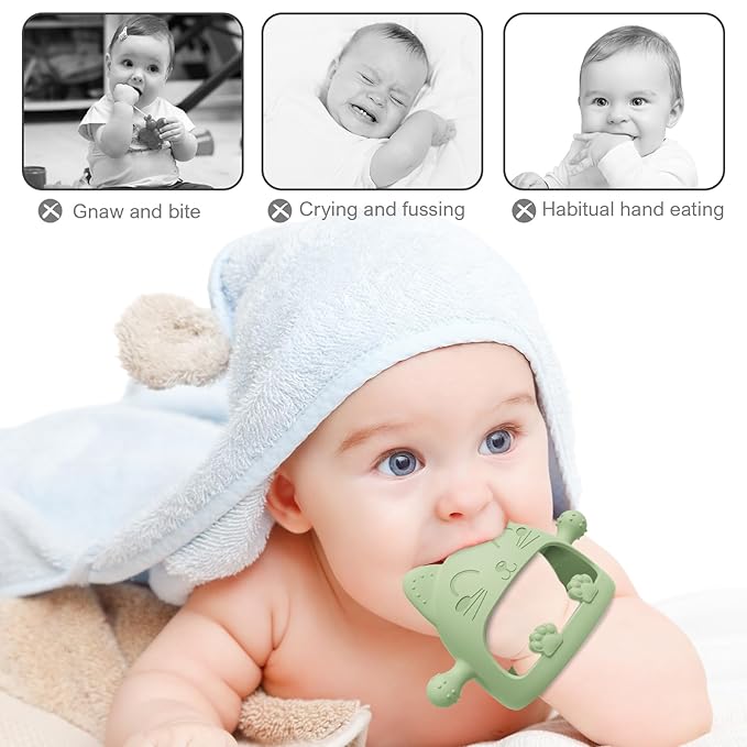 - 【Teething Toys For Babies 0-6 Months】Our cartoon cat baby teether is specially designed for newborns, the teether toys imitates a nipple shape on both sides,which may help babies transition from breastfeeding or bottle feeding to chewing on a teething toy,and soft silicone touch points on the top are designed to accommodate baby's bite in different directions. This design element can provide a familiar feel for babies and make them more comfortable with the teether