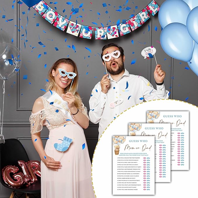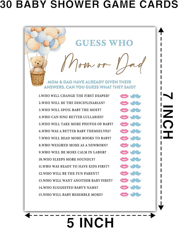 - Materials: The baby shower game cards are made of high-quality coated paper that is sturdy and thick. The guess who mom or dad game cards will allow you to write easily without worrying about ink penetration.β