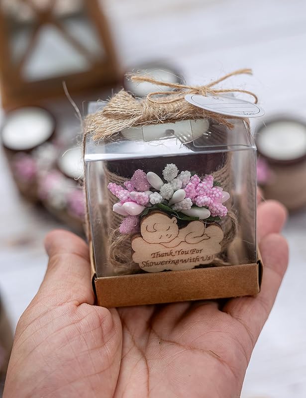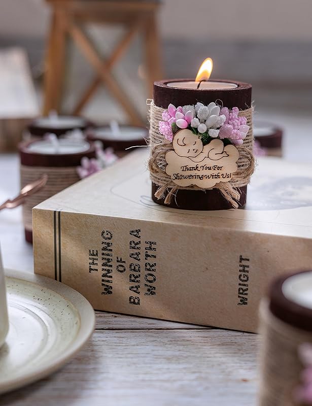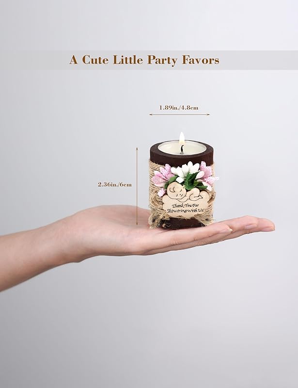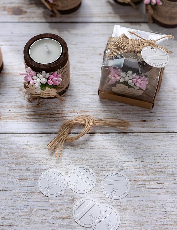 - ❤ Set Contents:10 wooden candle holders decorated with fresh flowers, 10 pieces of twine, 10 handwritten personalized tags. (You can personalize the round labels with baby's name and day, tied to the candle box with twine).