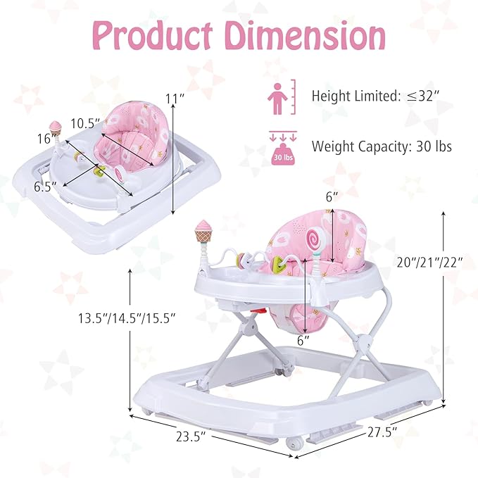 - 【3-Gear Adjustable Height】The HONEY JOY baby walker includes 3 easy-to-adjust height positions: 20”, 21”, and 22”, allowing you to adjust it according to your baby’s heights. It is designed to grow with your little one while your baby begins to crawl and explore.
